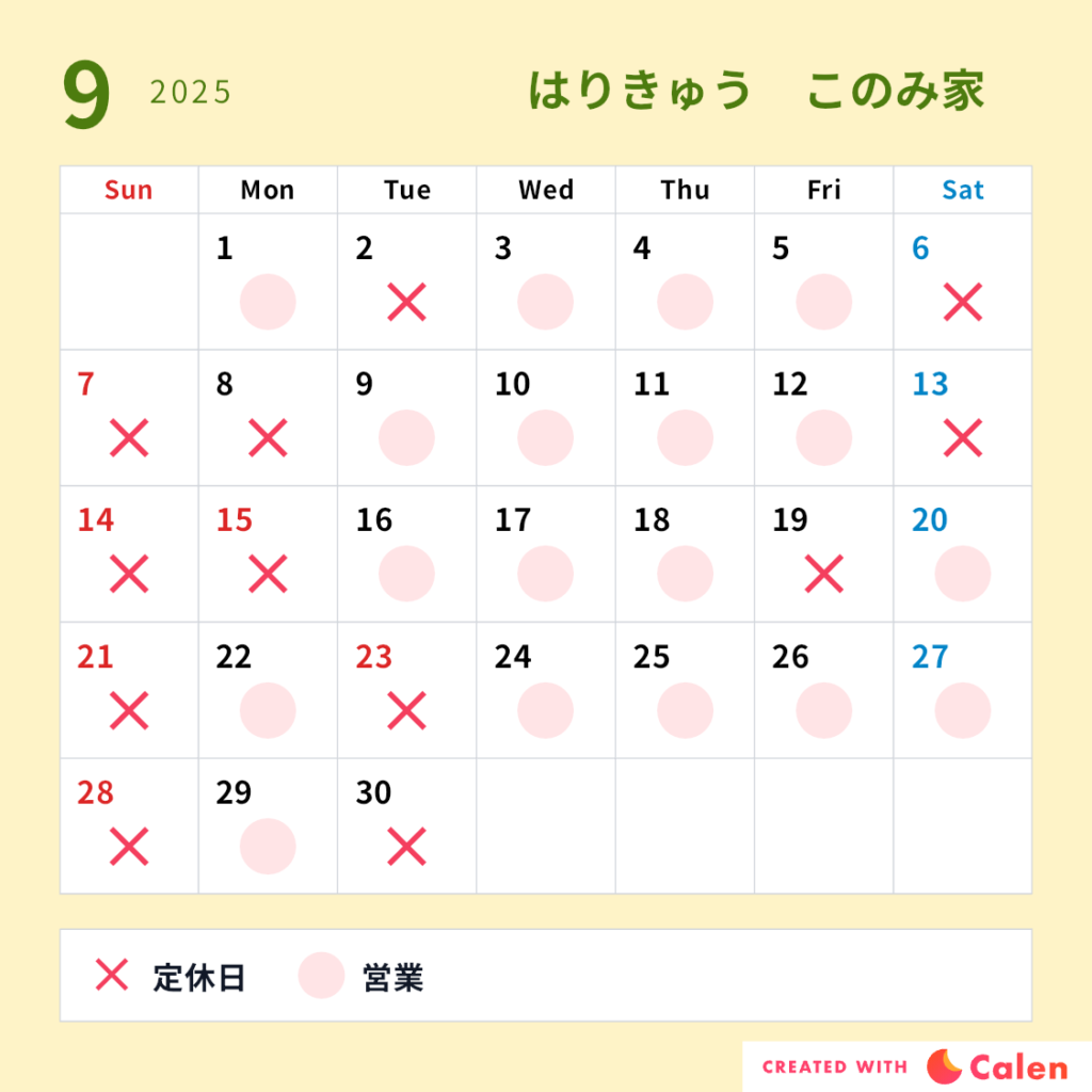 9月の営業日のお知らせです。